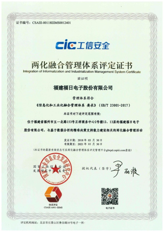 2018年3月30日,福建福日電子股份有限公司獲得了工信部?jī)苫诤瞎芾眢w系評(píng)定證書。公司2017年6月啟動(dòng)兩化融合管理體系貫標(biāo),打造信息化環(huán)境下的新型能力——基于數(shù)據(jù)分析的精準(zhǔn)決策支持能力,并于2017年8月列入工信部“2017年兩化融合管理體系貫標(biāo)試點(diǎn)企業(yè)名單”。通過(guò)本質(zhì)貫標(biāo),公司在福建省電子信息集團(tuán)系統(tǒng)先行先試,率先通過(guò)兩化融合管理體系貫標(biāo)評(píng)定。公司將不斷完善兩化融合管理體系,促進(jìn)兩化融合建設(shè)成果深化應(yīng)用,提升公司核心競(jìng)爭(zhēng)力。