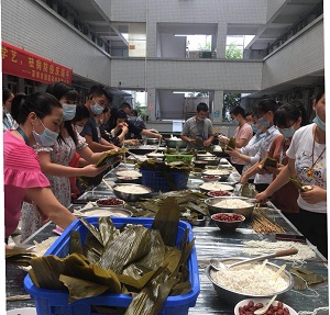 活動(dòng)現(xiàn)場(chǎng),糯米、紅棗、粽葉等材料擺放在桌子上。經(jīng)驗(yàn)豐富的員工向身邊的新手教授包粽子的方法,粽葉重疊再折疊,卷成漏斗狀后,用糯米、紅棗等充實(shí)壓緊,再用繩一繞一捆,一個(gè)個(gè)精美的粽子就誕生了。本次活動(dòng)歷時(shí)2小時(shí),參加活動(dòng)的員工手工制作了1000多個(gè)粽子。包好的粽子在公司食堂蒸熟后,公司人資部工作人員負(fù)責(zé)分裝粽子,總經(jīng)辦相關(guān)負(fù)責(zé)人分別走到各部門、倉(cāng)庫(kù)、宿舍等,將粽子分發(fā)到員工手上,讓員工充分感受到企業(yè)的關(guān)懷。